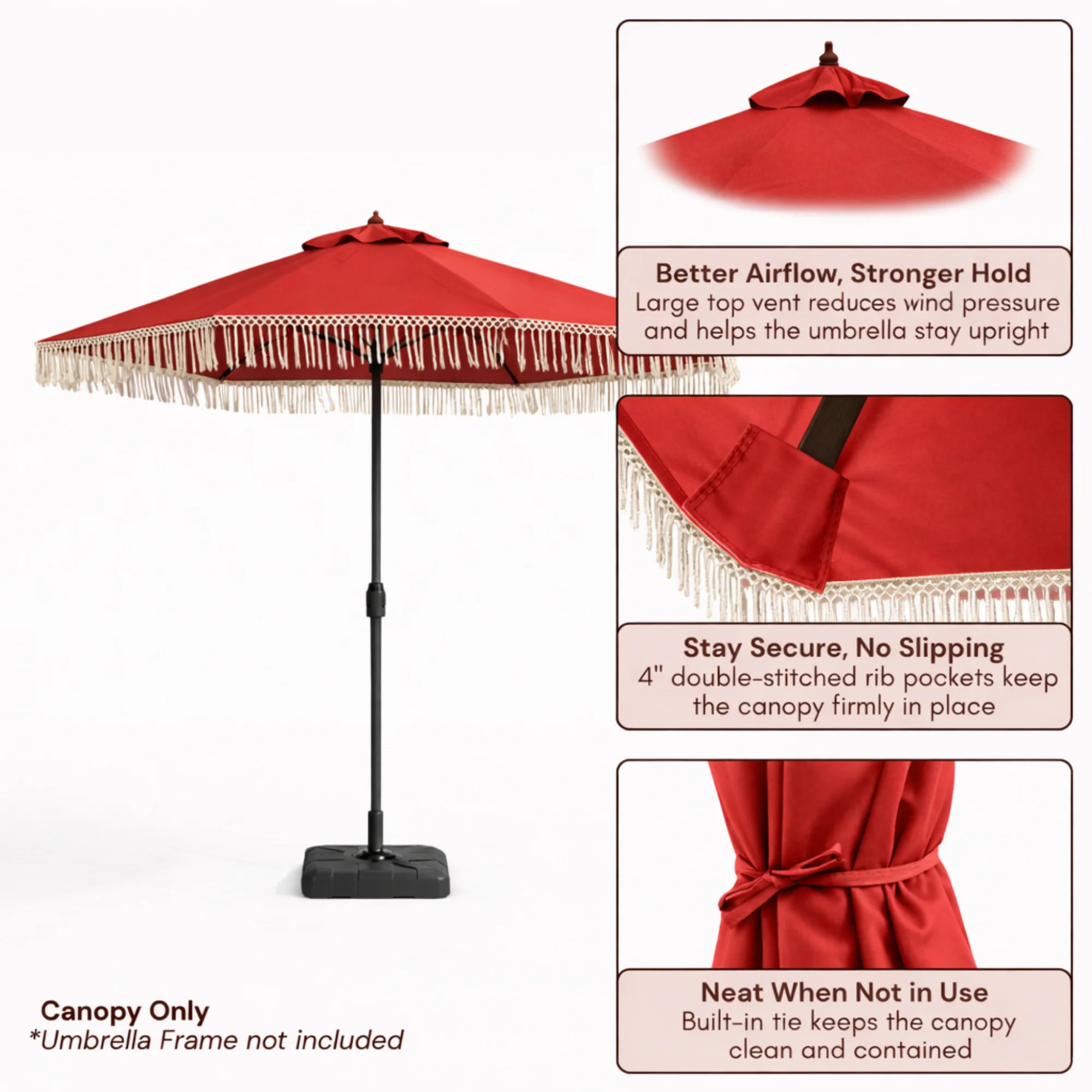 9ft 8 Ribs Replacement Umbrella Canopy w/ Tassels in Red (Canopy Only)
