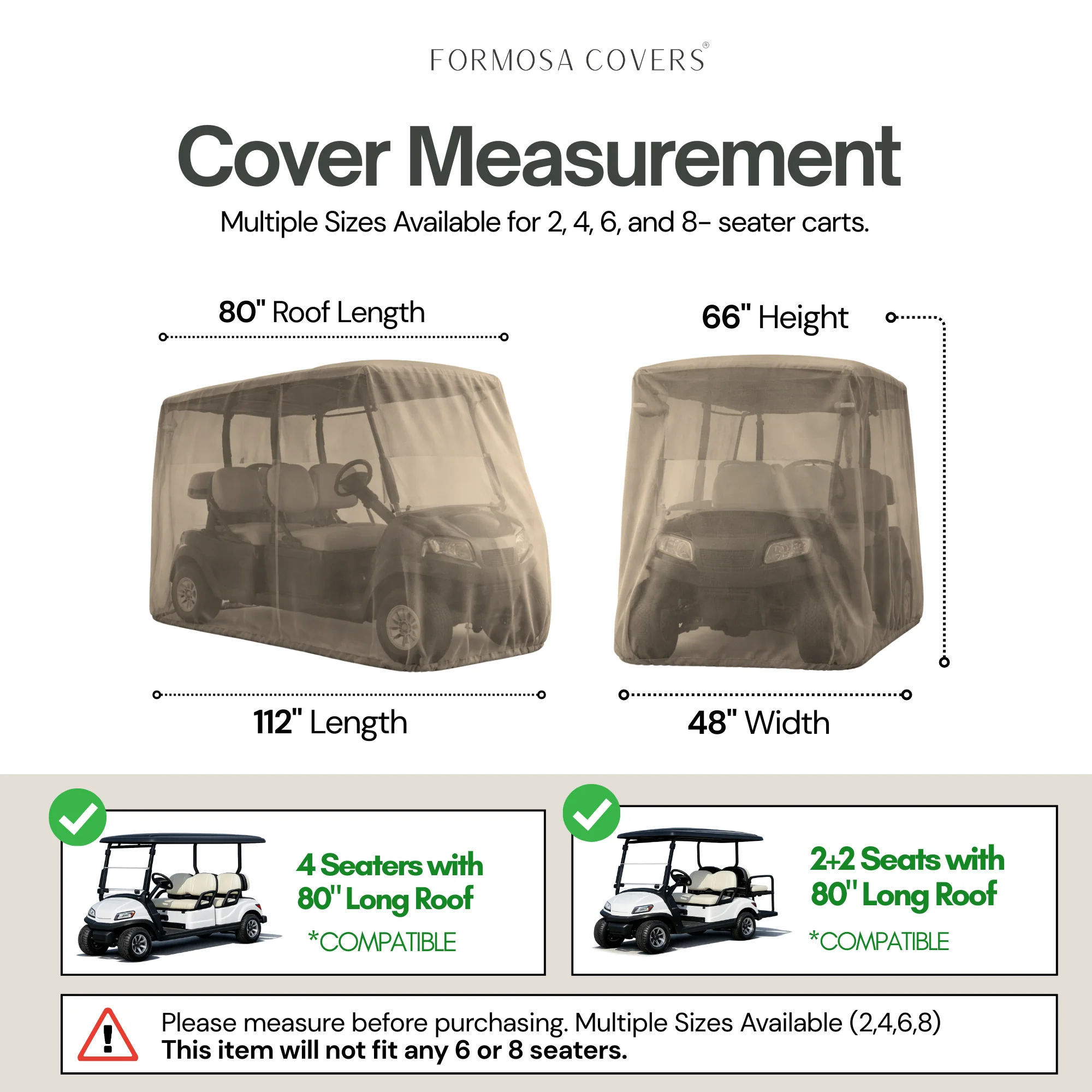 Designed exclusively for 2+2 golf carts with an extended 80 inch roof. Ideal as a 4 passenger golf cart cover for long roof EZGO, Club Car, and Yamaha models. This cover will not fit standard 58 inch roofs. Tailored coverage ensures full protection over both front and rear bench seating.