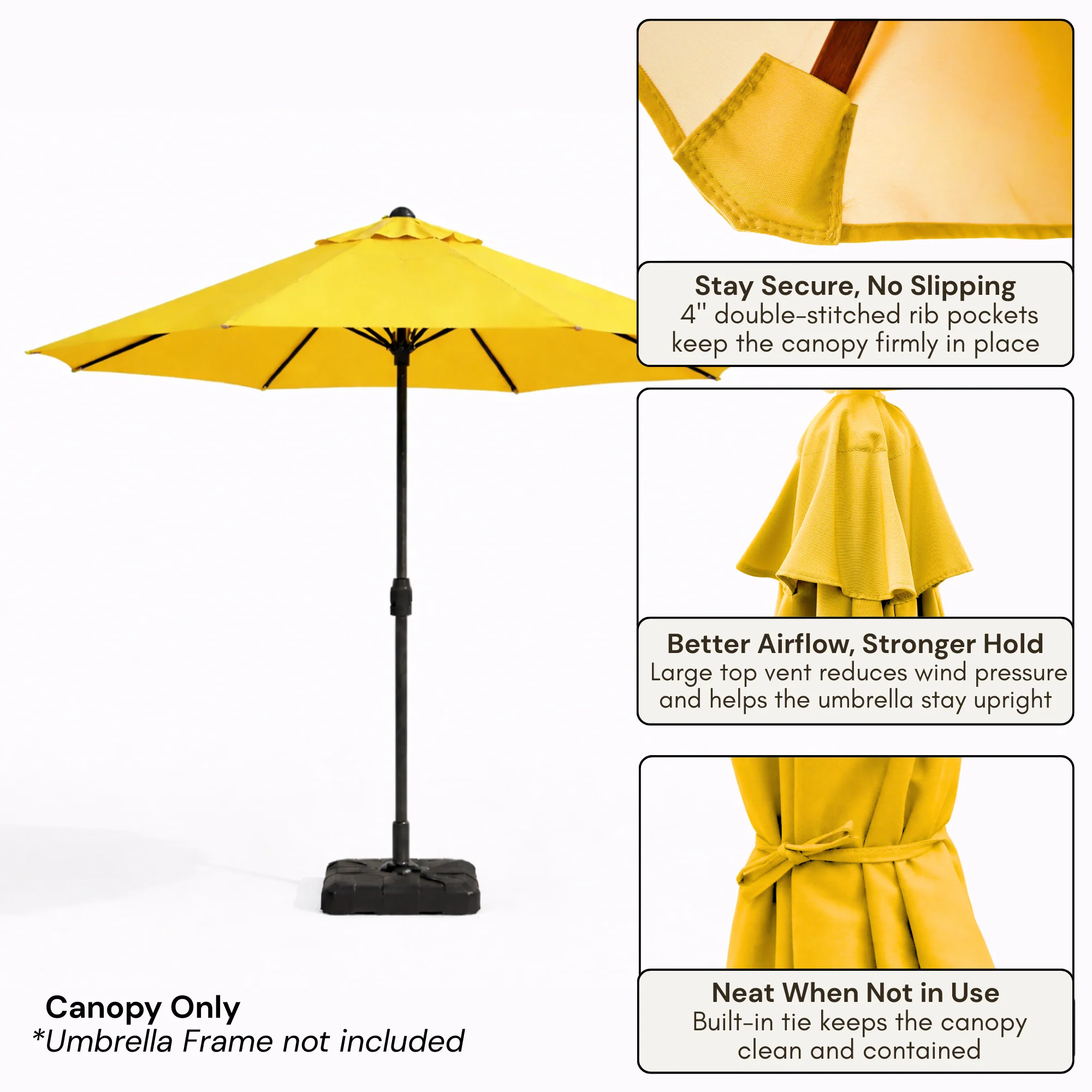 This 9ft 6-rib replacement canopy is precision-cut for market patio frames with rib lengths between 52 and 54 inches, settling into place with a fit that feels like it was always meant to be there. The solution-dyed Olefin fabric holds Yellow with a depth of color that outlasts standard polyester by up to 15 times, sheds rain with ease, and seats firmly against every rib the way original equipment should.