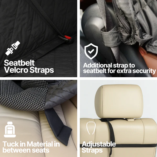 This water-repellent, quilted pet seat protector is designed for the front or rear single seats of most cars, trucks, and SUVs. It’s made from thick, padded woven polyester with a durable 75D backing — giving it a premium look and feel while shielding against scratches, dirt, shedding, and pet accidents. Ideal for daily errands, road trips, or trips to the vet, this dog car seat cover stays securely in place with adjustable buckle straps that attach around the headrest and seat base.