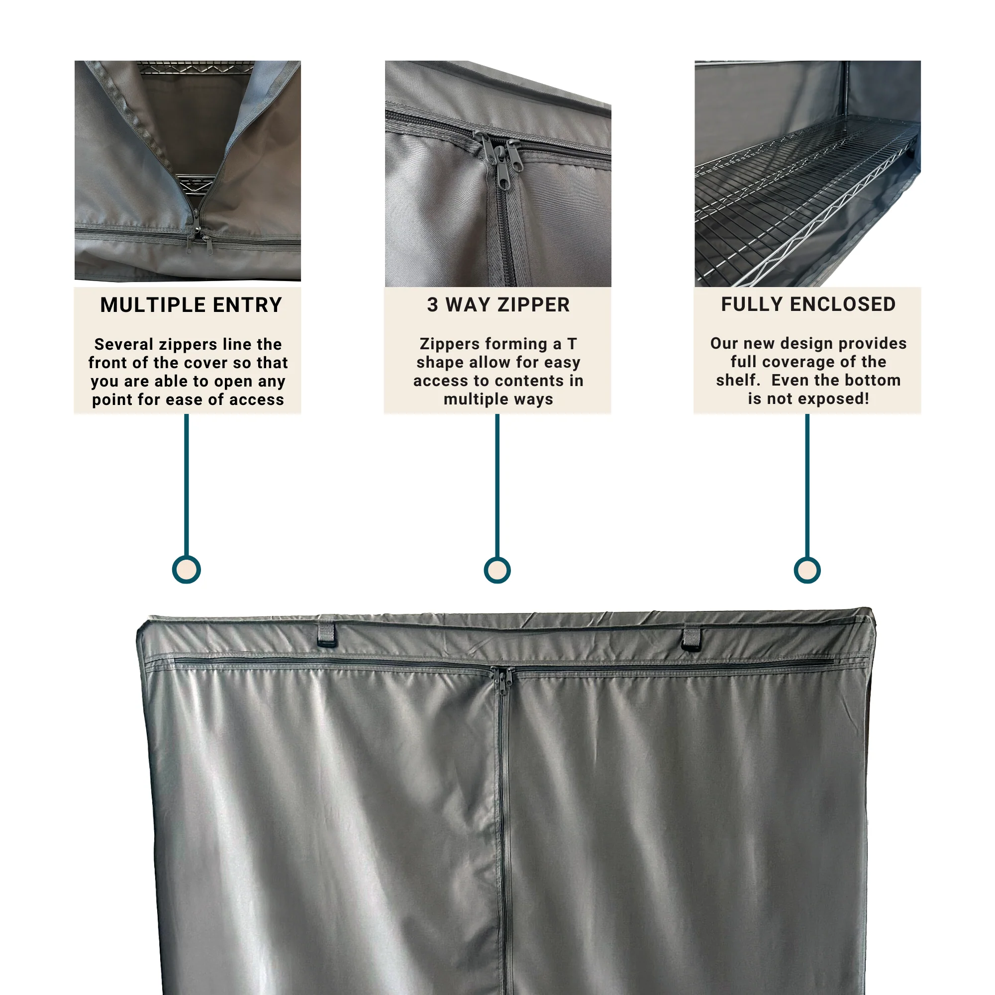 - Both panels feature 3 way zippers for easy in & out of the shelves